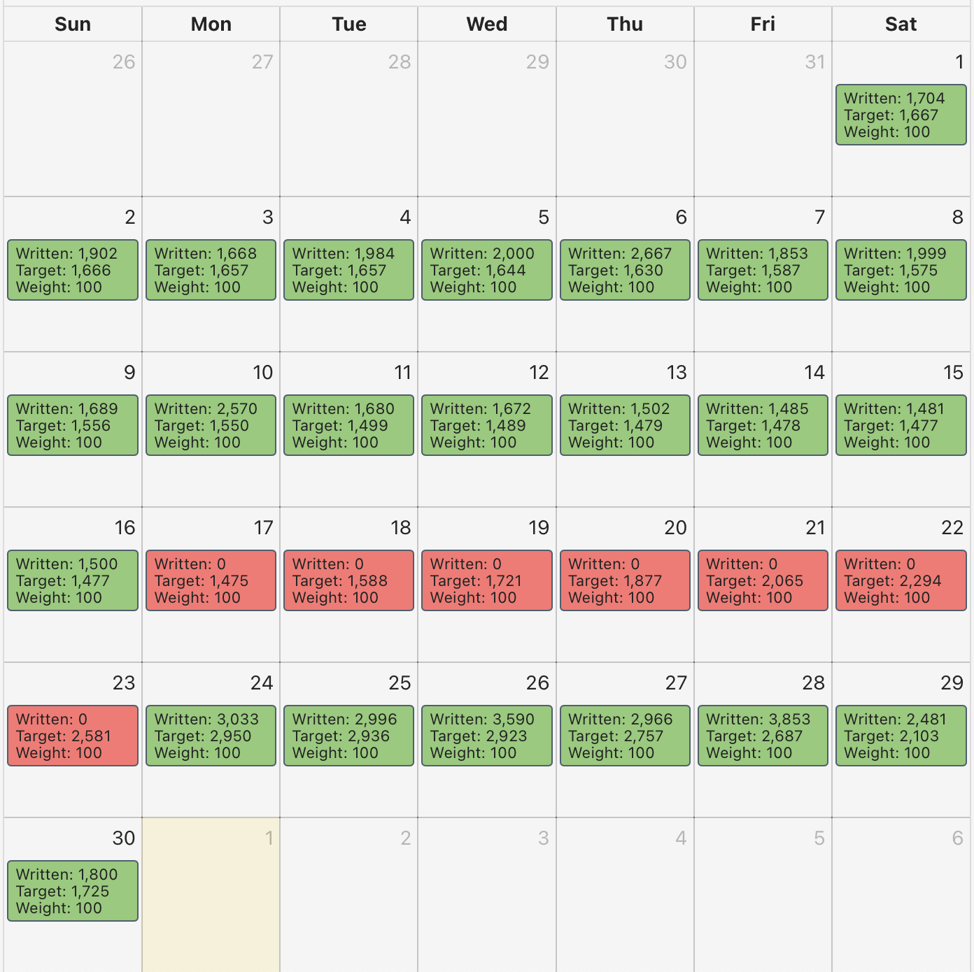 I tracked my daily word count using WriteTrack.cloud, which I highly recommend because it updates the next day’s goal based on today’s work.